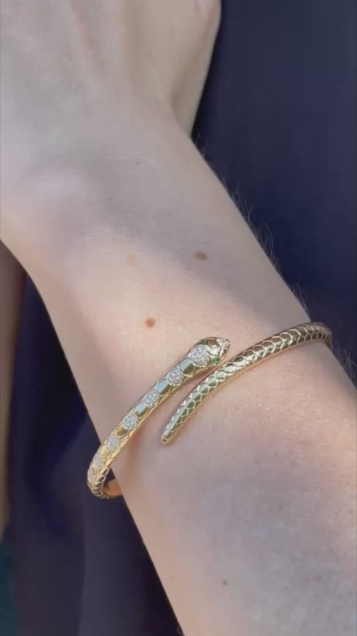 Bold, elegant, and endlessly captivating - this 14k yellow gold snake bangle wraps gracefully around the wrist, symbolizing transformation and strength. The serpent's body glimmers with 56 round brilliant cut diamonds, totaling 0.18 carats, intricately set to highlight its sleek, scaled design. Two green emerald eyes (0.03 carats total) add a striking finish, bringing this iconic motif to life with mesmerizing detail.