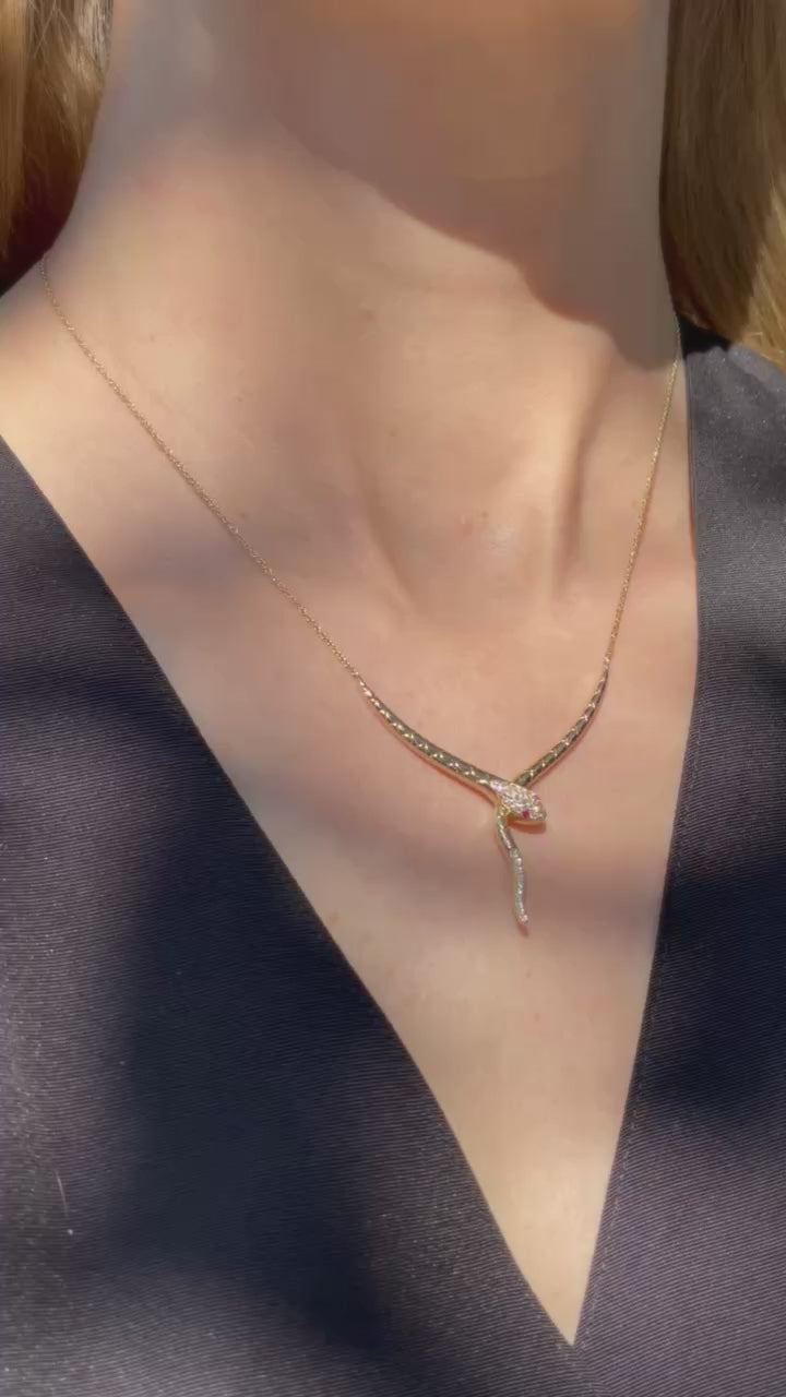 The serpent’s head dazzles with 0.25 carats of pavé-set round brilliant diamonds, catching the light from every angle, while two ruby accents (0.02 carats total) ignite the eyes with fiery intensity. The textured, diamond-cut gold body enhances the lifelike movement of the design, making this necklace as mesmerizing as it is timeless.