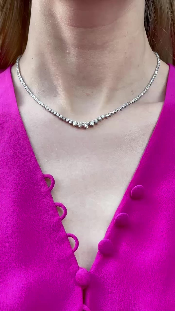 Drape yourself in brilliance with this mesmerizing 5.25 carat Graduated Diamond Rivière Necklace. Handcrafted in 14k white gold, this classic tennis design features a seamless line of 155 graduated round brilliant cut diamonds, each meticulously set in elegant three-prong settings. The subtle graduation draws the eye toward the center, creating a graceful flow of light and sparkle that flatters every neckline.
