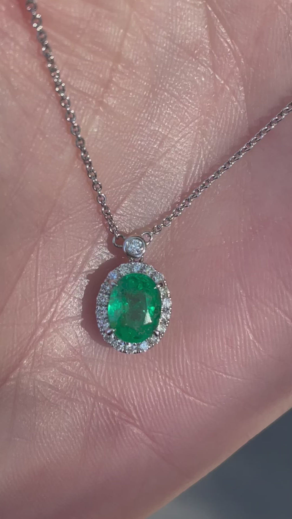 Radiant and refined, this Oval Emerald & Diamond Halo Necklace is crafted in luxurious 18K white gold. At its center rests a richly saturated 1.18-carat oval emerald, celebrated for its deep green hue and timeless allure. Surrounding the emerald, a halo of 19 round brilliant diamonds totaling 0.23 carats adds a sparkling frame that beautifully enhances the gemstone’s vivid color.
