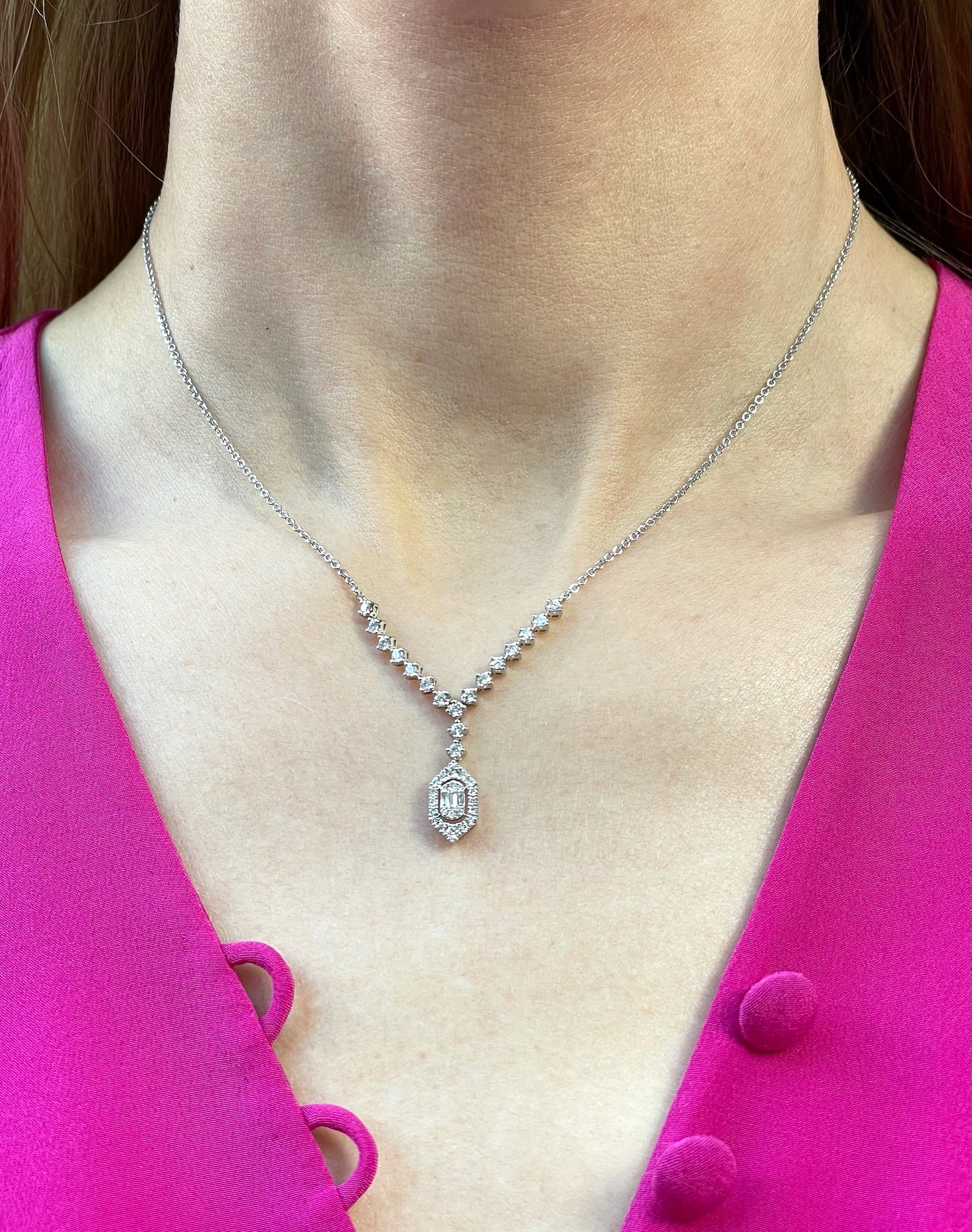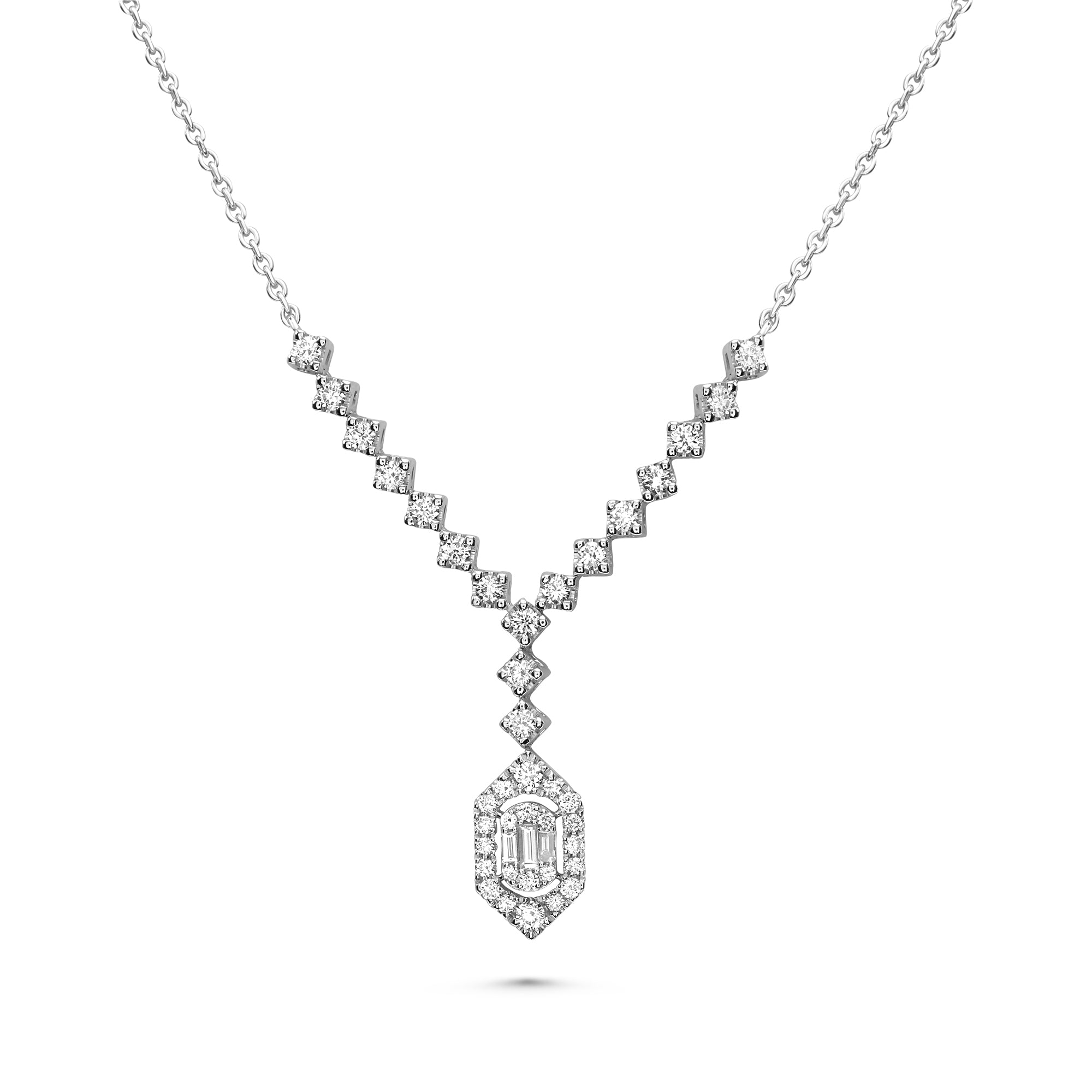 14k White Gold Diamond Drop Necklace with Baguette and Round Diamonds