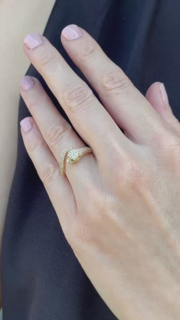 Fierce yet refined, this 14k yellow gold panther wrap ring is a striking symbol of strength, grace, and bold luxury. The panther's head and band are adorned with round brilliant cut diamonds, totaling 0.48 carats, creating a dazzling pavé surface that sparkles with every movement. Two striking green emerald eyes (0.03 carats total) bring the panther to life, adding a captivating contrast against the brilliance of the diamonds and warm glow of yellow gold.