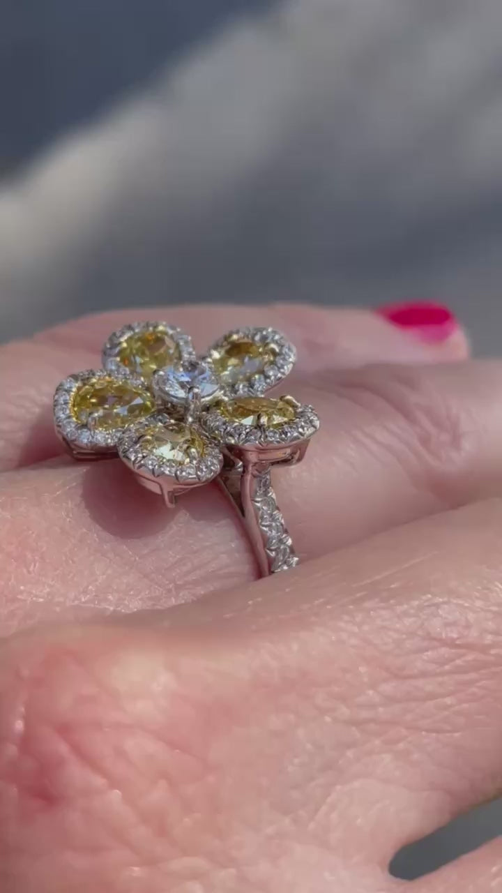 Celebrate the artistry of fine jewelry with this breathtaking Mixed Yellow and White Diamond Flower Ring, meticulously crafted in 18K white and yellow gold. Five shimmering pear-shaped fancy yellow diamonds form delicate petals, each framed by a halo of brilliant white diamonds that enhance their vivid color and natural fire. At the center blooms a radiant round brilliant white diamond, adding exquisite sparkle and perfect symmetry to the floral design.
