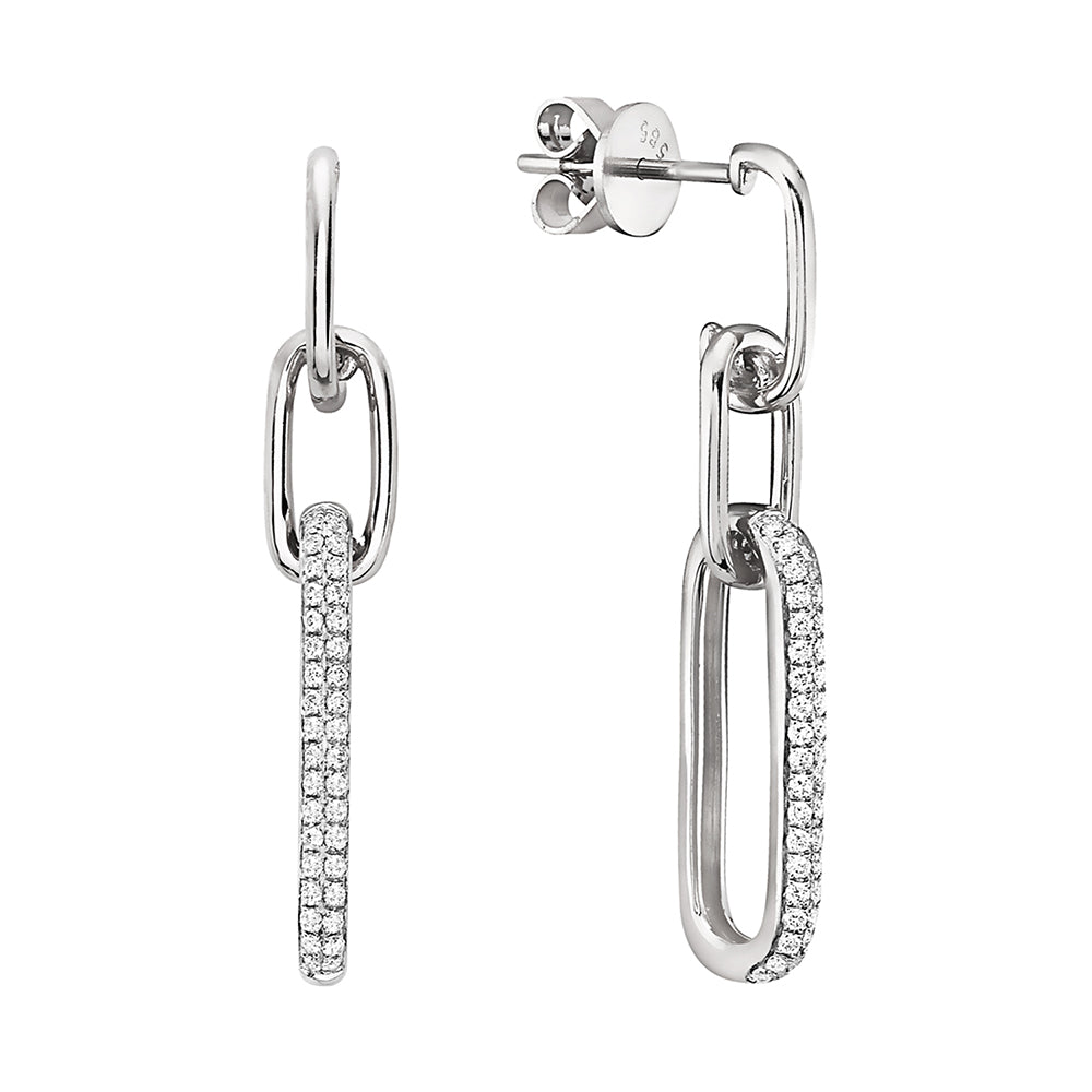 Elevate your everyday look with these stunning 14K White Gold Paperclip Link Drop Earrings. Featuring a modern link design, the bottom link is slightly larger and fully encrusted with round brilliant cut diamonds, totaling 0.29 carats. These earrings effortlessly transition from day to night—pair them with a tee and jeans for a cool, casual vibe, style them under a blazer for a polished office look, or let them shine as the perfect statement for an evening out.