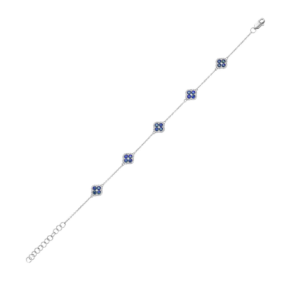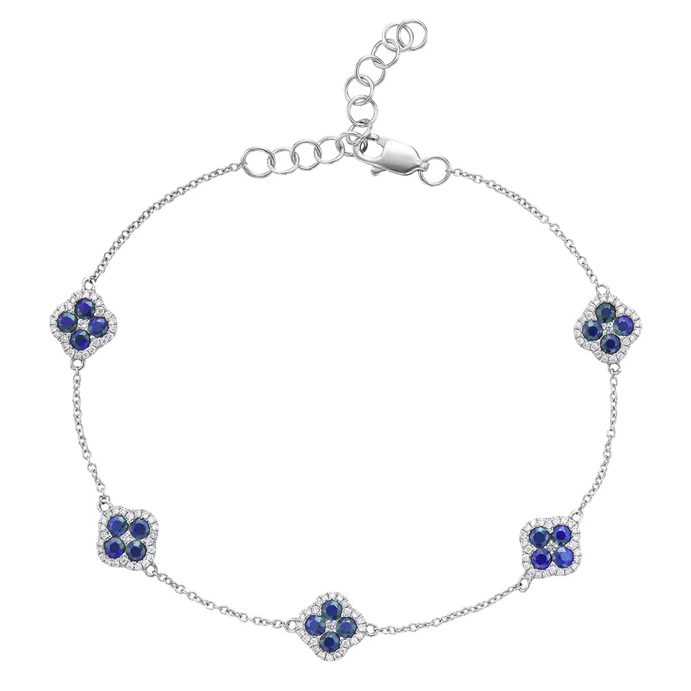 Add a touch of elegance and sophistication to your jewelry collection with this stunning 14K White Gold Blue Sapphire & Diamond Clover Chain Bracelet. Featuring intermittent clover-shaped stations, each adorned with four deep blue sapphires and a brilliant diamond center, surrounded by a delicate diamond pavé outline, this bracelet exudes timeless beauty.
