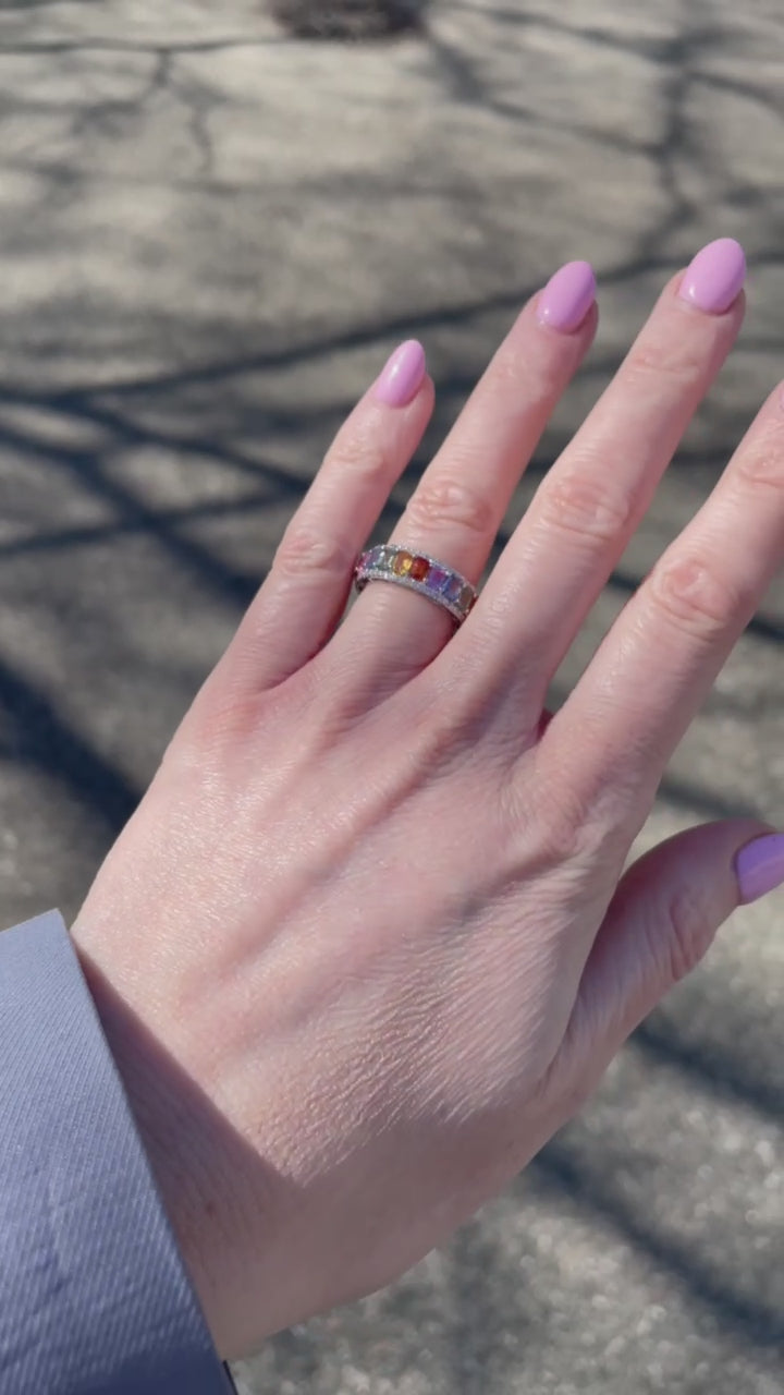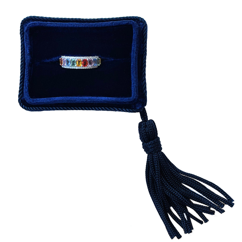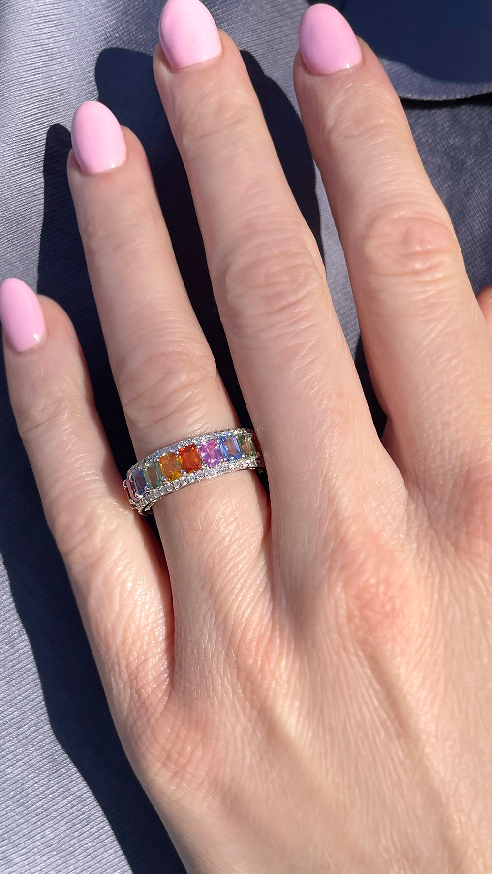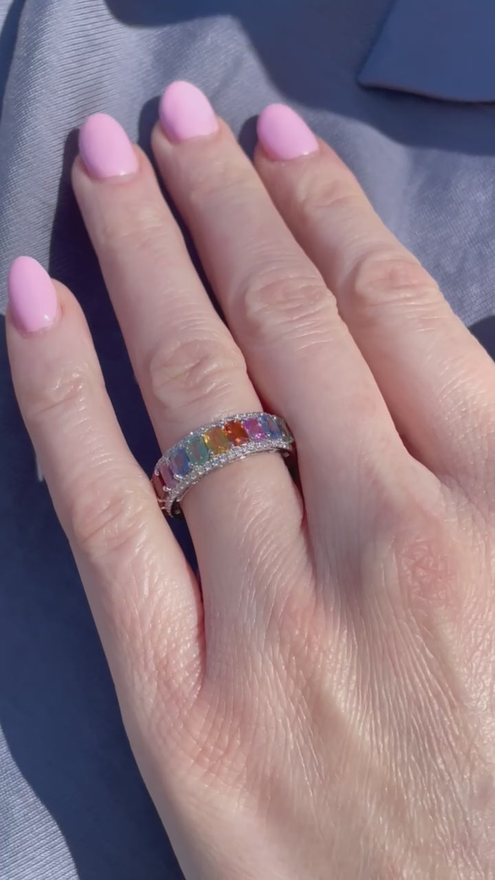 Bold, brilliant, and bursting with color — this 18K White Gold Rainbow Ring is a true celebration of joy, elegance, and individuality. Featuring a dazzling spectrum of multi-color sapphires, this vibrant band is beautifully accented with sparkling diamonds for a look that’s as radiant as it is refined.