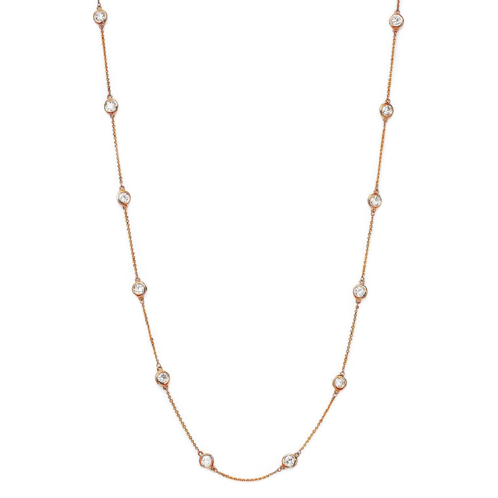 Are you in search of a captivating and versatile diamond necklace that can be worn daily or for special occasions? Look no further than this stunning piece, featuring a scattering of dazzling, bezel-set diamonds set along a delicate yellow gold chain. The carefully spaced diamonds create a shimmering effect that beautifully adorns your neckline. Designed to be worn continuously, even during activities like showering and swimming, this necklace effortlessly elevates any ensemble with its glamorous touch. Its elegant simplicity makes it ideal for everyday wear, adding a touch of sophistication to your look. 2.60 carats of diamonds set in 14K Rose Gold. The length is 18" with an adjustable closure loop at 16".