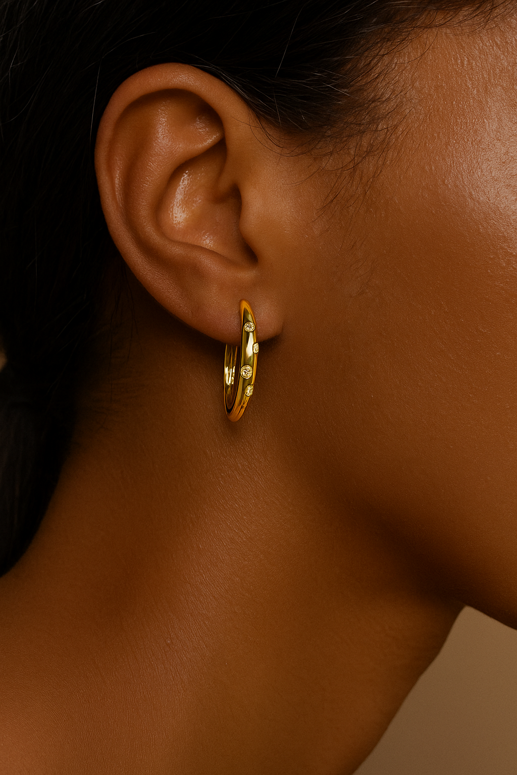 For those seeking a discreet and modern alternative to traditional diamond hoops, this yellow gold diamond hoop is the perfect choice. Crafted from solid yellow gold all the way around, this hoop features scattered burnished diamonds throughout the front of the earring. The subtle sparkle and highlights around the ear add a touch of glamour without the need for a solid diamond line, making it a versatile and chic option for any occasion. Elevate your style with this contemporary and understated yellow gold diamond hoop that effortlessly enhances your look with a hint of sparkle and sophistication. These Earrings are made in 14K Yellow Gold weighing 2.7 Grams, with 10 Round Brilliant Cut Diamonds with a total carat weight of 0.18CTS.