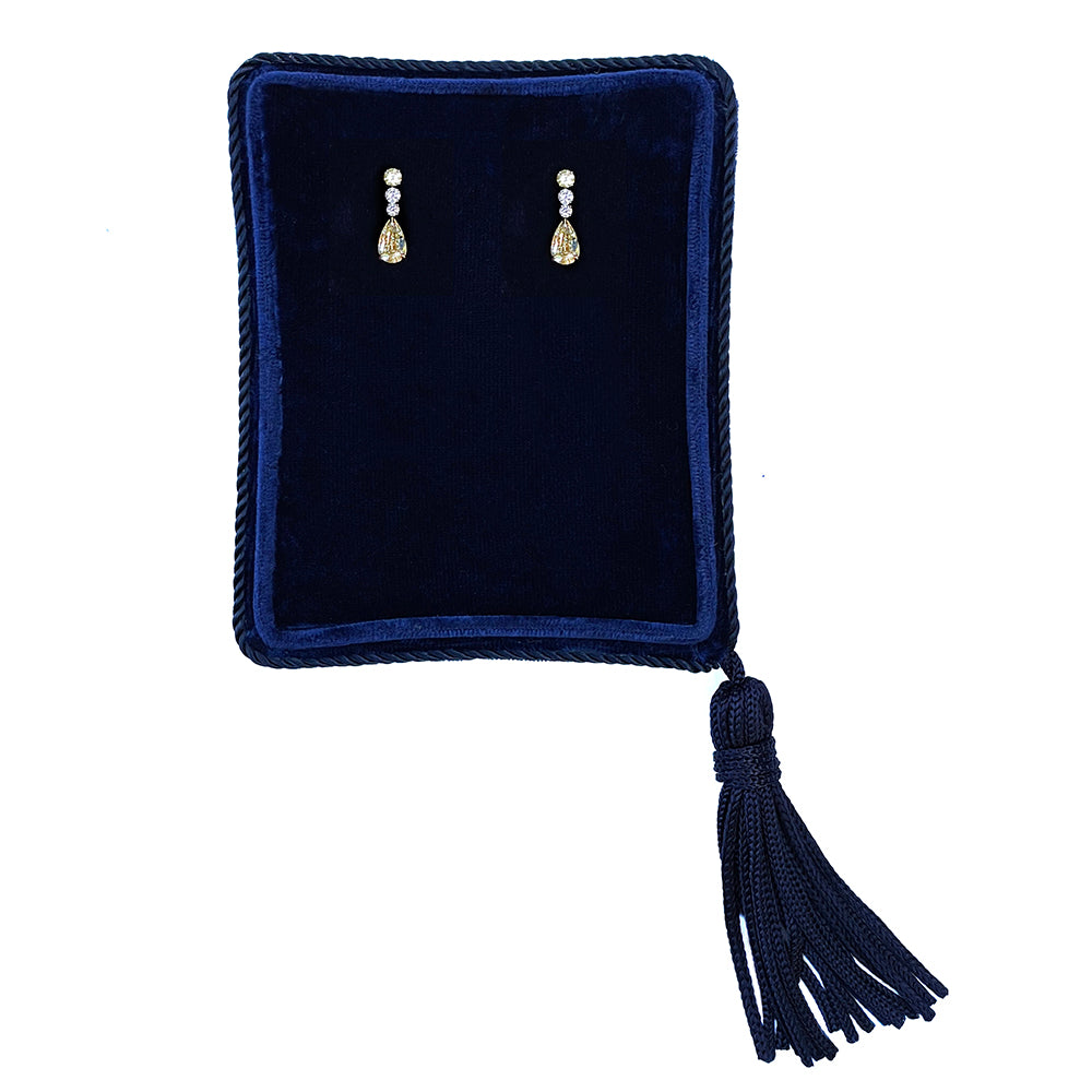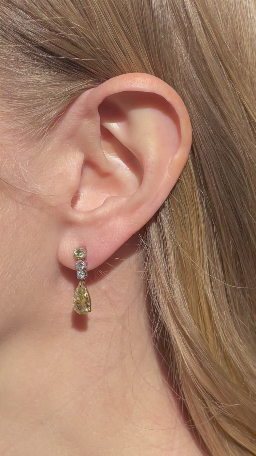 Elegance meets brilliance in these 18K White & Yellow Gold Diamond Dangle Earrings, a breathtaking blend of luminous white and vibrant yellow diamonds. Designed to captivate, each earring features a round brilliant yellow diamond at the top, followed by two sparkling round brilliant-cut diamonds, leading to a dazzling yellow pear-shaped diamond that delicately dangles, enhancing movement and light reflection.