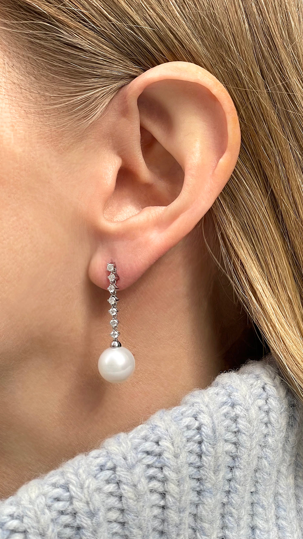 Elevate your elegance with these 18K White Gold South Sea Pearl & Diamond Drop Earrings, a timeless blend of sophistication and radiance. Designed to captivate, each earring features seven sparkling round brilliant diamonds in a delicate drop setting, gracefully leading to a lustrous 10-11mm South Sea pearl at the base. The 14 diamonds, totaling 0.42 carats, add brilliance and movement, enhancing the natural glow of the pearls.