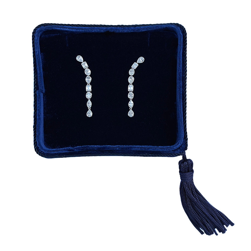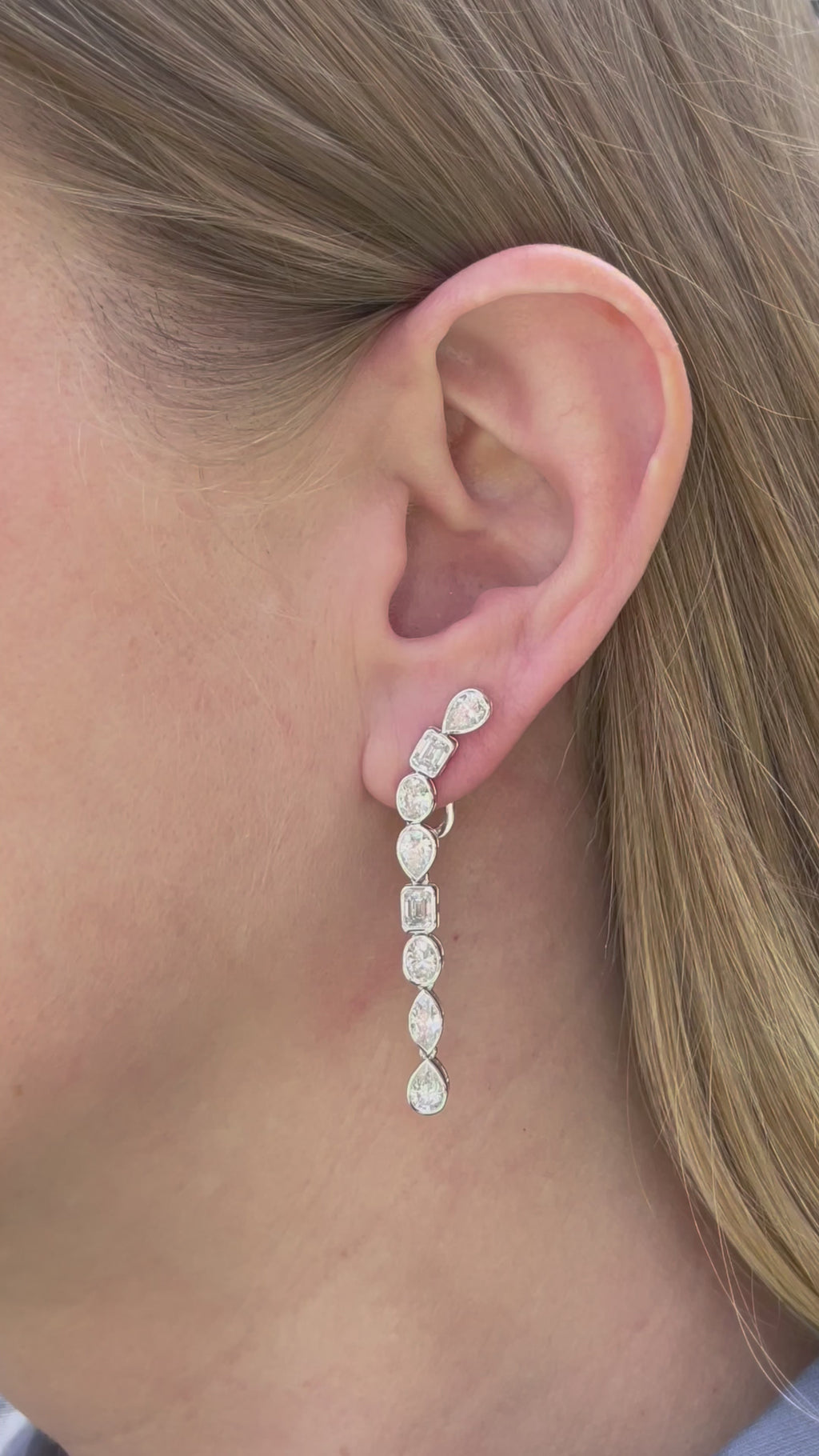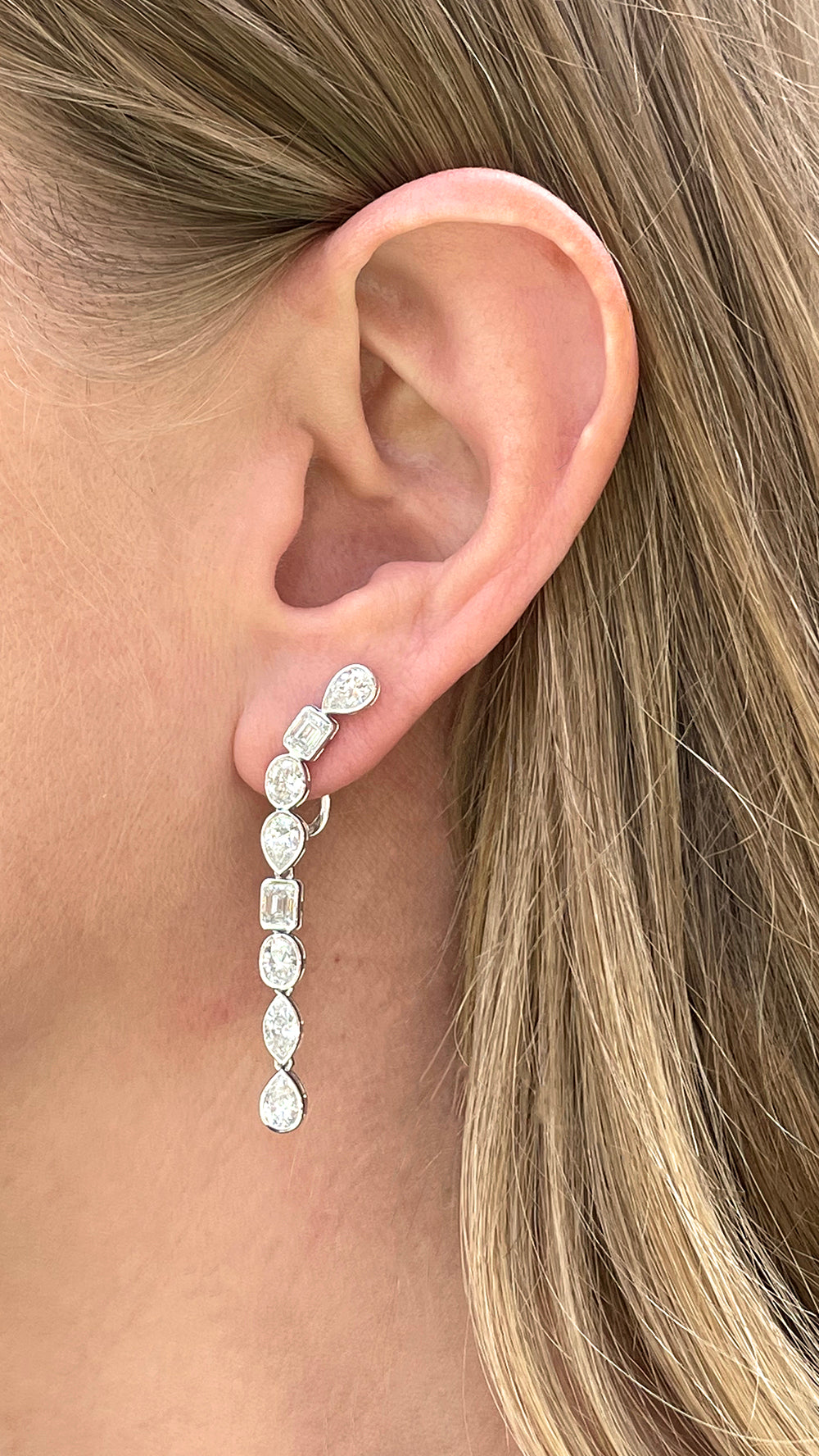 Each diamond is bezel-set to highlight its shape while allowing maximum light to reflect, creating a radiant, fluid line of movement. The sophisticated combination of shapes adds dimension and drama, making these drop earrings the perfect statement piece for special occasions or elevated everyday wear.