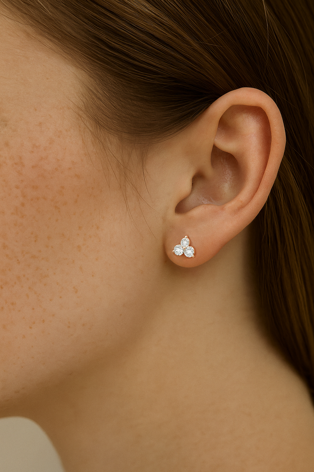 These captivating Ethereal Triad Diamond Earrings are truly a sight to behold, available in three different sizes to suit your preference. This particular size features three 10-point diamonds (each one .10 carats) clustered together in a stunning diamond leaf pattern that delicately adorns each ear. Comparable in size to a quarter carat each studs, these petite earrings exude beauty and elegance, offering a lovely and graceful touch to any earlobe. The total diamond carat weight of this pair is 0.60cts (0.30 carats per earring) set in 14K Rose Gold.