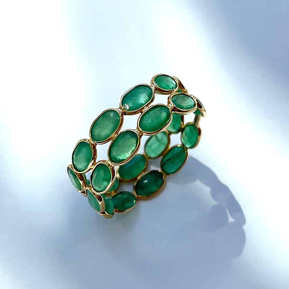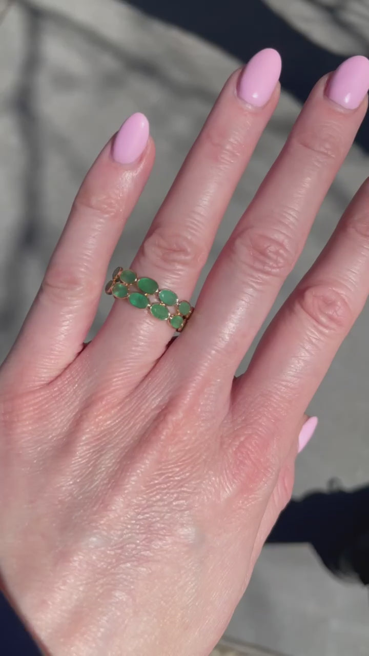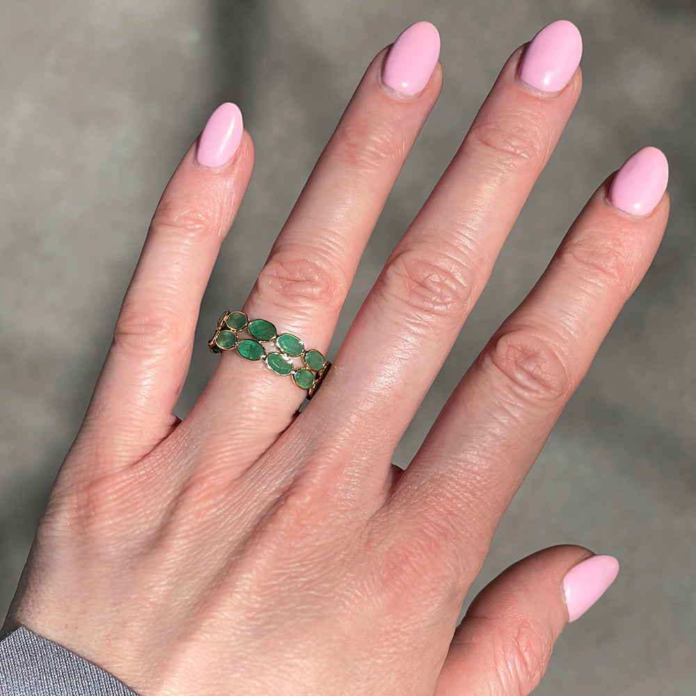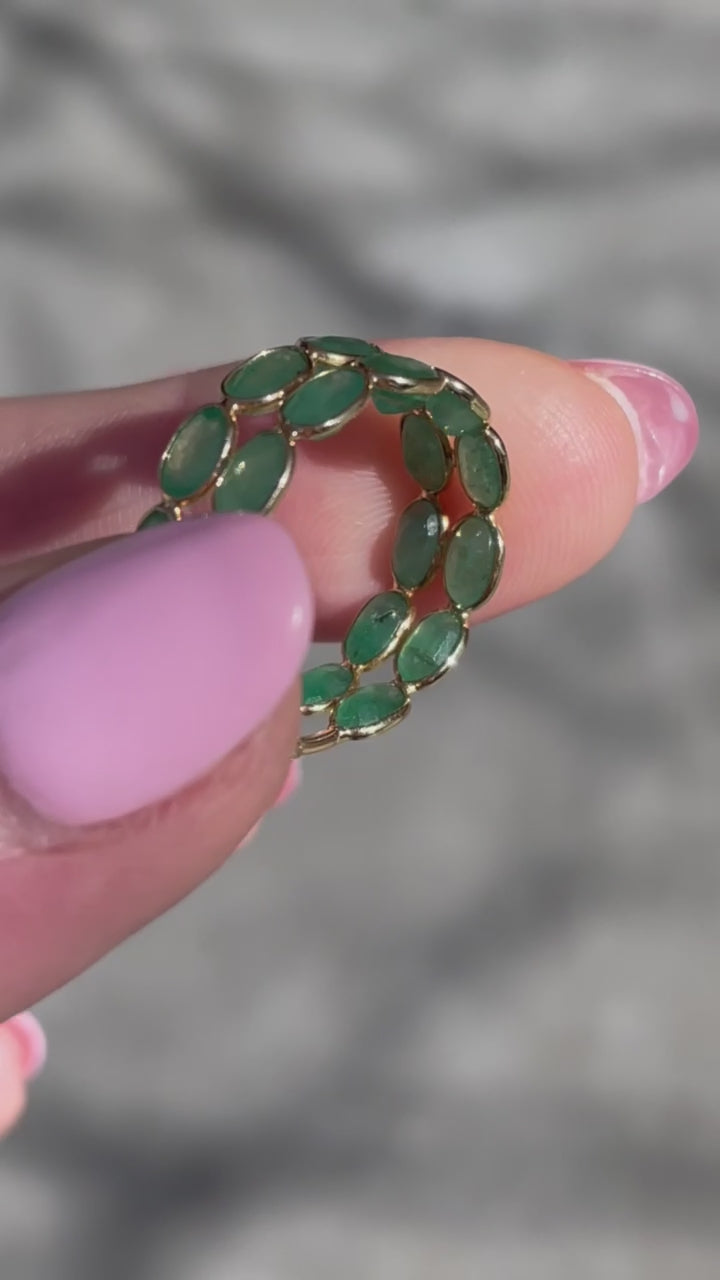Set in warm 18K yellow gold, the rich green hue of the emeralds pops beautifully, making this piece perfect for stacking, styling solo, or gifting to someone who loves standout, colorful jewelry. The rose-cut faceting adds a vintage-inspired charm while maximizing light reflection for extra sparkle.