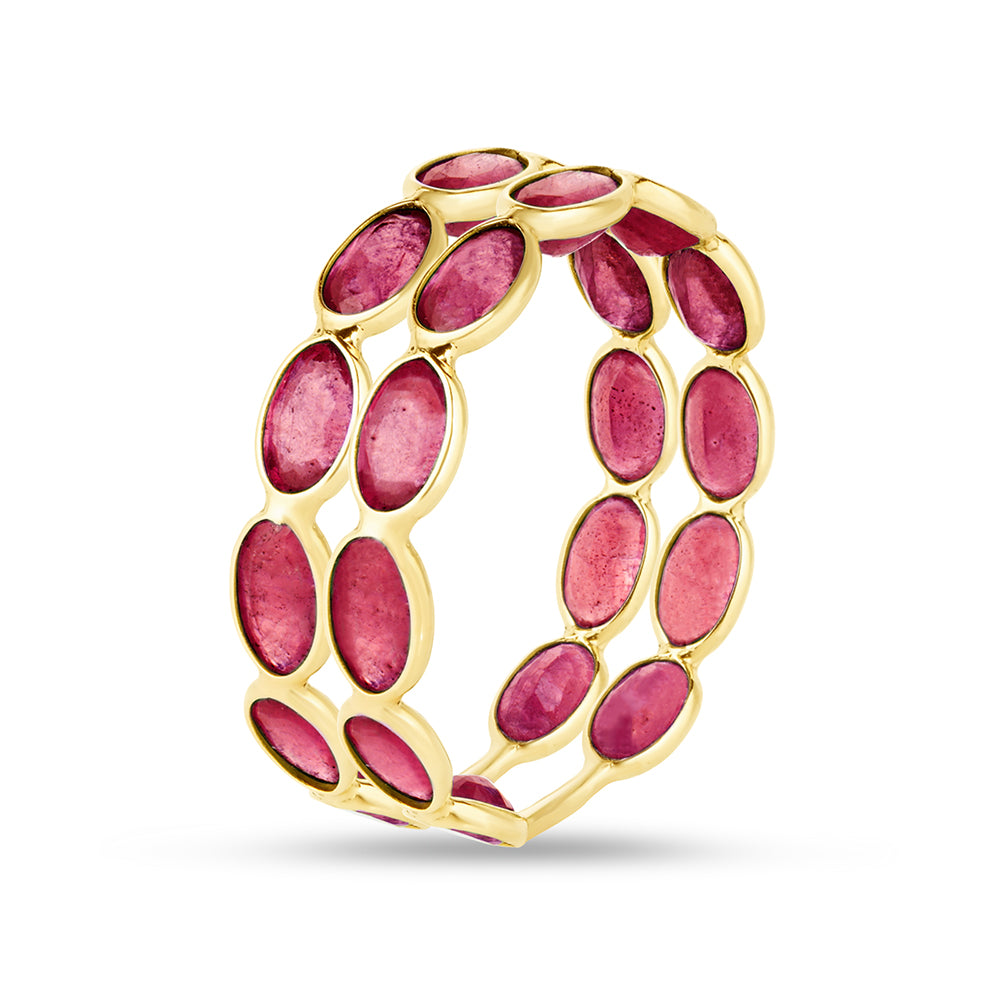Fierce, fiery, and full of passion — this 18K Yellow Gold Double Row Ruby Ring is the ultimate statement of bold elegance. Set with 6.25 carats of richly hued rose-cut rubies, this design radiates warmth and intensity in every facet.
