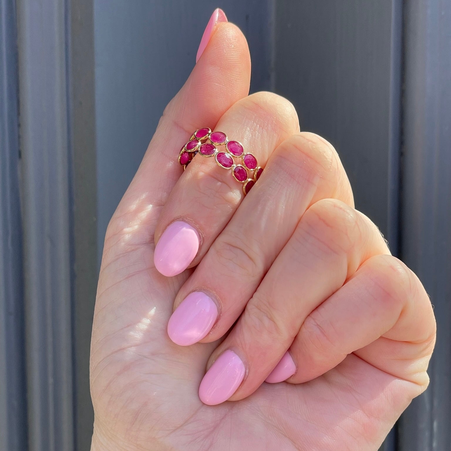 The double row band creates a powerful silhouette, while the rose-cut rubies bring an old-world charm with modern flair. The deep red tones are beautifully enhanced by the 18K yellow gold setting, making this ring a standout piece that’s impossible to ignore.